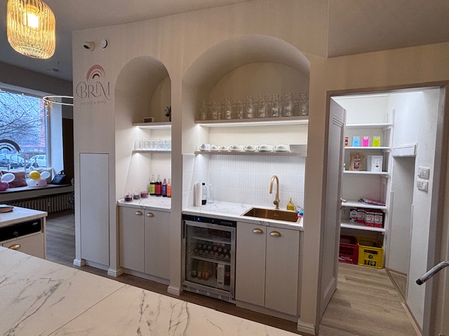V obchodních prostorách bytového domu jsme prováděli rekonstrukci prostor v památkově chráněné zóně v Ostravě Porubě. Jednalo se o prostory pro společnost BRIM s.r.o. a jednalo se o prostory kavárny, spojené s výukovými a administrativními prostory pro provádění poradenských služeb v oblasti speciální pedagogiky. Budova byla postavena v 50tých letech v dobovém architektonickém stylu SORELA. Tato skutečnost kladla zvýšené nároky na stavební a technologické postupy při vlastní rekonstrukci. Byly kompletně rekonstruovány prostory o celkové půdorysné ploše cca 400 m2 na prostory luxusní kavárny a moderního zázemí pro poradenské služby. Za zmínku stojí nové zbudování sociálního zázemí - WC muži/ženy v "kavárenském" designu a v podobném stylu rovněž provedení luxusního kavárenského nábytku. Samozřejmostí je, že prostory jsou větrány a klimatizovány.